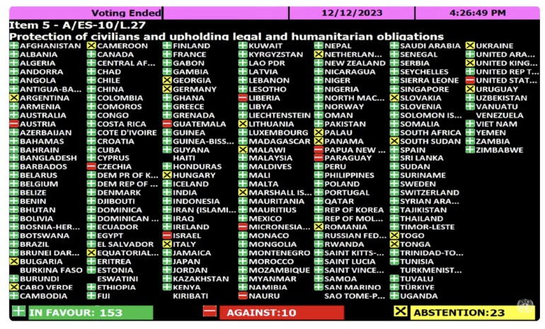 Cuatro días después de la resolución del Consejo, la Asamblea General del organismo internacional, integrada por todos los países miembros, votó a favor de exigir un alto el fuego humanitario inmediato en Gaza. La moción fue aprobada por ciento cincuenta y tres votos a favor. Los votos en contra -en los hechos un apoyo a la causa israelí- fueron sólo diez. Además de Estados Unidos e Israel, de Europa la rechazaron Austria y República Checa; de África, Liberia; de Oceanía, Micronesia, Nauru y Papúa Nueva Guinea; y de América Latina sólo Guatemala y Paraguay. Los que se abstuvieron fueron veintitrés, pero esta postura no fue neutral. Evitaron apoyar una resolución que en los hechos era desfavorable para Israel. La Argentina, en la primera decisión de política exterior del presidente Javier Milei, votó de esta manera. Lo hizo junto con Panamá y Uruguay de América Latina. El Reino Unido también se abstuvo, como lo hiciera en la votación del Consejo de Seguridad. De Europa acompañaron esta posición Bulgaria, Alemania, Georgia, Hungría, Italia, Lituania, Países Bajos, Rumania, Eslovaquia y Ucrania. De África lo hicieron Cabo Verde, Camerún, Guinea Ecuatorial, Malawi, Sudán del Sur y Togo; de Oceanía se abstuvieron Islas Marshall, Palau y Tonga. En el continente asiático no se registraron abstenciones.